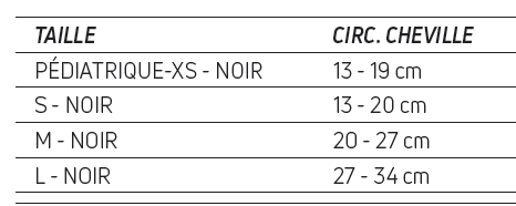 Selon la taille, la hauteur de la guêtre est adaptée pour un maintien optimal : 10 cm pour la taille XS (enfant) et 13 cm pour les autres tailles. Un coussinet en mousse positionné à l’arrière améliore le confort et réduit les zones de pression, même lors d’un port prolongé.
